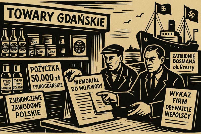 Materiał podany w sprawozdaniu z 7 bm. znajduje swoje potwierdzenie w memoriale wystosowanym do Pana Wojewody przez Stowarzyszenie Samodzielnych Rzemieślników i Mniejszych Przemysłowców w Gdyni. Memoriał ten, ogłoszony w numerze 35 „Dziennika Gdyńskiego” przedkładam w załączniku. Poza tym w dniu 10 lutego br. odbyło się zebranie członków Zjednoczenia Zawodowego Polskiego, na którym poruszono również między innymi sprawę zatrudnienia w Gdyni w charakterze starszych robotników, dozorców, bosmanów i marynarzy, obywatel gdańskich i obywateli Rzeszy. W dniu 12 bm. zgłosili się do mnie przedstawiciele Zjednoczenia Zawodowego bym w tej sprawie ingerował u pracodawców. Ponieważ przyniesiony przez przedstawicieli Zjednoczenia materiał dowodowy okazał się niekompletny, zabrali go z powrotem, z tym jednakże, że w najkrótszym czasie przedłożony [przez] mnie zostanie wykaz firm, zatrudniających obywateli niepolskich. Poza tym zgłaszali się gdańszczanie do [Adama] Słupskiego, właściciela hotelu i restauracji, budującego obecnie palarnię kawy, proponując mu większą pożyczkę na stosunkowo niski procent. Słupski propozycję odrzucił. Nie odrzucił [jej] natomiast [Stanisław] Lisiecki właściciel domu i kawiarni „Grand Cafe” przyjmując od gdańszczan pożyczkę w wysokości 50 000 [zł]. W zamian miał się między innymi podobno zobowiązać do podawania w swym lokalu tylko piwa gdańskiego. Przedstawiciel browarów gdańskich w Gdyni [niejaki] Vogel, wg zebranych przez Urząd Bezpieczeństwa danych rozporządza dowolnie, zarówno terminami płatności, jak i cenami, byle tylko rynek zdobyć dla wyrobów gdańskich. W większości sklepów w Gdyni spotyka się jeżeli nie wyłącznie, to w znacznej większości towary gdańskie.