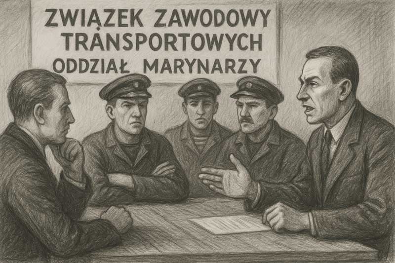 Sytuacja od ostatniego zebrania nie [uległa] zmianie. Pertraktacje pomiędzy pracodawcami i Zjednoczeniem Zawodowym jeszcze nie [zostały] rozpoczęte. W dziale marynarzy, organizowanie ich w Zjednoczeniu Zawodowym, posuwa się naprzód, aczkolwiek z większymi przeciwnościami niż należało przypuszczać. Związek Zawodowy Robotników Transportowych Oddział Marynarzy trzyma się w dalszym ciągu. W dniu 12 bm. korzystając z obecności w Gdyni Dyrektora Departamentu Morskiego p. [Teodozego] Nosowicza, [Związek] wysłał delegacje by Urząd Morski [w Gdyni] podjął się organizowania z pośród członków Związku Transportowców załóg, czy to dla nowych statków polskich, czy też uzupełnienia załóg statków obcych.