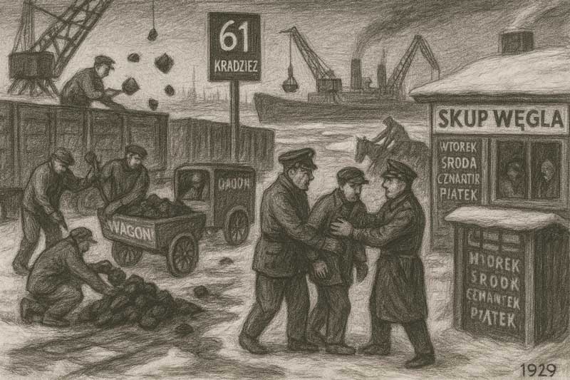 Na skutek panujących mrozów zwiększyła się w znacznym stopniu ilość kradzieży, zwłaszcza tzw. węglowców. Węgiel kradną nie tylko robotnicy zatrudnieni przy przeładunku, ale jeszcze w większym stopniu rozmaici włóczędzy, których napływ do Gdyni ustawicznie wzrasta, pogarszając stan bezpieczeństwa. Kradzież węgla dokonuje się nie tylko przez wyrzucanie brył węglowych z wagonów, ale również podjeżdżanie w biały dzień wozami czy platformami pod wagony, a nawet zdarzały się wypadki podjeżdżania pod dźwigi przeładunkowe, skąd sypano węgiel wprost na furgony. W samym mieście szereg składów zajmuje się skupowaniem skradzionego węgla. Dziennie Policja [Państwowa] zatrzymuje o kilkadziesiąt centnarów metrycznych węgla pochodzącego z kradzieży. Sprawy przeciwko winnym kierowane są do Sądu [Grodzkiego w Gdyni], jednakże wobec nadmiernego obciążenia Sądu [Grodzkiego] w Gdyni, rozpoznanie spraw następuje po kilku, czy kilkunastu tygodniach, co w danej chwili na ukrócenie przestępczości dodatnio nie wpływa. Za czas od 7 do 13 bm. Zanotowano[:] 61 kradzieży, w czym jedną z włamaniem [na] przeciętnie 10 kradzieży. Spraw zza opilstwo wszczęto 11, za wykroczenie przeciwko przepisom meldunkowych 3, o ruchu kołowym 2, sanitarnym 8, budowlanym 1, przemysłowym 1, za nieprzestrzeganie godzin w handlu 2. Pożarów zanotowano 2, które straży ogniowej udały się umiejscowić i ugasić bez spowodowania większych strat.