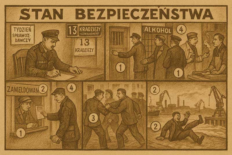 W dniu 18 bm. Józef Lange z Tempcza (pow.[iat] Morski), zatrzymany przy kradzieży węgla, usiłował powalić na ziemię i rozbroić policjanta. W dniu 16 bm. zatrzymano kupca Ludwika Senidowicza z Poznania (Garbary 5), za uprawianie w pociągu gry hazardowej w karty. Dnia 17 bm. postrzelił się w lewą rękę i lewą nogę marynarz Fritz Arendt ze statku niemieckiego „Indra”, oglądając na stole w restauracji Machczyńskiego rewolwer. W dniu 15 bm. podczas bójki ranny nożem w rękę został Kozłowski. Sprawcę [zajścia] – Ambroszczyka zatrzymano. Dnia 14 bm. podczas awantury i bójki w „Café London” zraniony w czoło butelką od piwa został marynarz norweski Daniel Hansen. Dnia 18 bm. do restauracji [„Pod Dębem” Jakuba] Wojewskiego przybyli pijani monterzy, żądając wódki, [a] gdy im odmówiono wszczęli bojkę, w czasie której usunięto ich z lokalu. Obydwaj monterzy z bójki wyszli silnie pokaleczeni, otrzymując każdy po kilka ran ciętych w głowę. W dniu 14 bm. podczas ładowania towarów wpadł do luku okrętu i odniósł poważne obrażenia cielesne robotnik Franciszek Rendziak. W dniu 20 bm. Wiktor Litwiński uległ nieszczęśliwemu wypadkowi przy ładowaniu węgla w porcie i złamania lewej nogi w dwóch miejscach oraz uszkodzenia prawej nogi. Walenty Kurzepa podjął nieprawnie z Urzędu Pocztowego 50 zł gotówką, podając się za Jana Kurzepę.