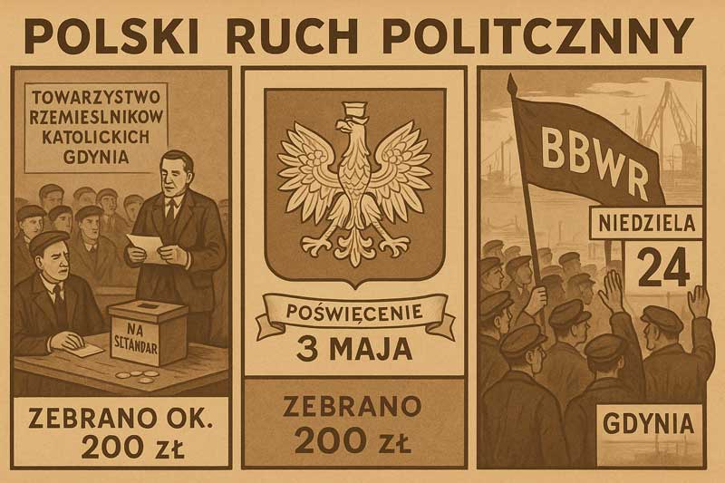 Zapowiedziany na niedzielę 24 b[ieżącego] m[iesiąca]. przyjazd do Gdyni posłów z klubu B[ezpartyjnego] B[loku] [Współpracy z Rządem] wywołał pewne ożywienie w miejscowych stosunkach. Nadzwyczajne zebranie Towarzystwa Rzemieślników Katolickich w Gdyni w dniu 17 bm. uchwaliło opodatkować swych członków na kupno sztandaru, którego poświęcenie [po]winno się odbyć w dniu 3 maja b[ieżącego] r[oku]. Na powyższy cel zebrano około 200 zł[otych].