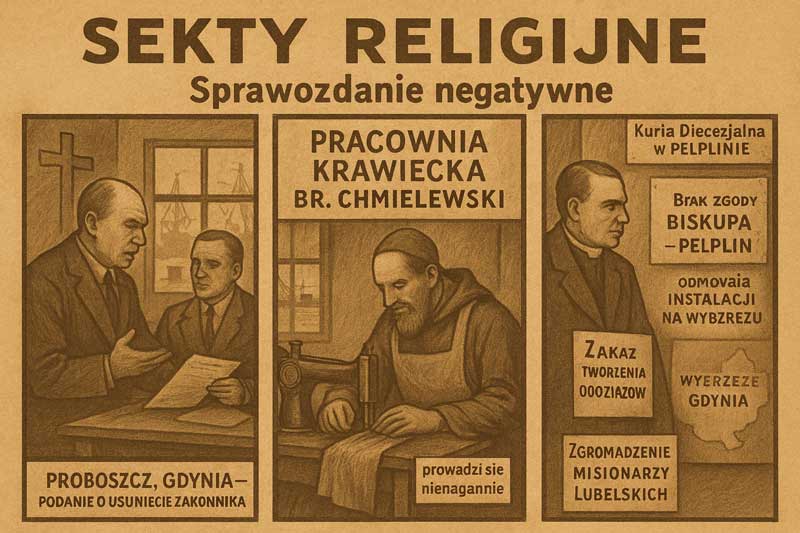 Sprawozdanie negatywne. Wspomnieć należy, że w Gdyni otworzył pracownię krawiecką zakonnik Chmielewski ze Zgromadzenia [Księży] Misjonarzy Lubelskich, nie otrzymawszy uprzednio zgody ks[iędza]. biskupa w Pelplinie na prawo instalowania się na wybrzeżu. Z tego tytułu zwrócił się do mnie miejscowy ksiądz proboszcz o spowodowanie usunięcia z terenu [Gdyni] zakonnika Chmielewskiego. Według wiadomości jak[ie] posiadam zakonnik ten, wykonując swoje rzemiosło, prowadzi się nienagannie. Zgromadzenie [Księży] Misjonarzy Lubelskich jest źle notowane u władz kościelnych, które odmawiają misjonarzom prawa tworzenia oddziałów.