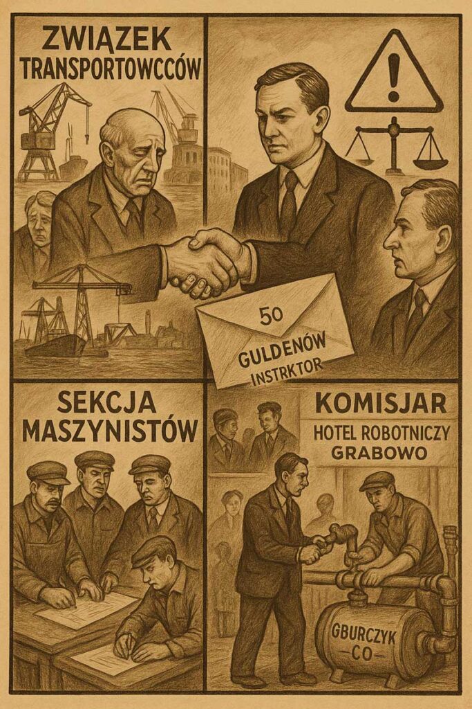 Zjednoczenie Zawodowe Polskie [Oddział w Gdyni] nawiązało bliższy kontakt z[e] Zjednoczeniem Zawodowym Polskim w Gdańsku, na czele którego stoi poseł [Antoni] Lendzion. Zjednoczenie [Zawodowe] Gdańskie ma pomagać finansowo Oddziałowi gdyńskiemu, przeznaczając między innymi 50 guldenów miesięcznie na utrzymanie w Gdyni trzeciego instruktora. Jest to suma, którą normalnie Gdańsk przekazywał centrali. Poza tym poseł Lendzion i inni zobowiązali się przybywać na urządzane w Gdyni zebrania robotnicze z referatami i pogadankami. W tej sprawie zachodzi tylko jedno niebezpieczeństwo, by menerzy gdańscy nie starali się zbytnio forsować stawek płacy w Gdyni i nie dążyli do podciągnięcia ich do skali gdańskiej. To by bowiem ujemnie odbiło się na obrotach portu gdyńskiego. Zdaniem pracodawców na razie nie do przeprowadzenia są w Gdyni specjalne dodatki dla robotników, pracujących [na] drugiej zmianie, względnie [na] trzeciej, jakie wprowadzone zostały w wielu portach bałtyckich, co w rozmowach starają się lansować kierownicy Zjednoczenia Zawodowego [Polskiego] w Gdyni. Zjednoczenie Zawodowe [Polskie] w Gdyni obecnie organizuje sekcję maszynistów, do której zapisują się zarówno maszyniści okrętowi, jak i dźwigowi oraz inni zatrudnieni na terenie miasta.