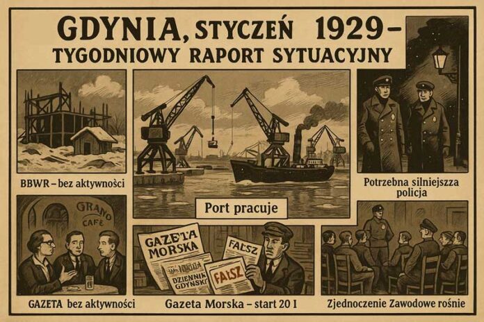 Na tle mrozów i spowolnienia robót budowlanych życie polityczne niemal zamarło: BBWR bez inicjatyw, Stronnictwo Narodowe faktycznie nieobecne, aktywność ograniczyła się m.in. do spotkania niemieckich działaczy z posłem Pankratzem. Prasa przegrupowuje się: słaby „Dziennik Gdyński”, zapowiedziana „Gazeta Morska” (red. W. Downarowicz), możliwe likwidacje „Gazety Gdańskiej”, „Dziennika Gdyńskiego” i tytułów kaszubskich; inne dzienniki rozszerzają działy gdyńskie. W stowarzyszeniach: „Sokół” działa, „Strzelec” tkwi w reorganizacji; PCK, ZOR i „Kropla Mleka” prowadzą zbiórki i zabawy. W ruchu zawodowym po przegranym strajku słabnie Związek Transportowców, a Zjednoczenie Zawodowe odzyskuje wpływy i szykuje podwyżkę stawek do 1,30 zł/h oraz postulaty socjalne; powstaje Stowarzyszenie Rzemieślników Katolickich. Władze alarmują o propagandowych pogłoskach o „zamarznięciu” portu (nieprawdziwe) i wskazują na potrzebę wzmocnienia Policji oraz utworzenia silnego działu śledczego wobec napływu „elementu niepożądanego” i wzrostu przestępczości (włamania na Kamiennej Górze, napaści, wypadki). Zwraca się też uwagę na germanizację w przestrzeni publicznej i nadmierne zatrudnienie cudzoziemców kosztem bezrobotnych Polaków.