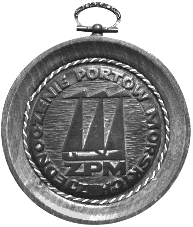 Pośrodku na fakturowanej powierzchni trzy stylizowane dźwigi i napis ZPM (emblemat Zjednoczenia Portów Morskich). Wzdłuż krawędzi napis ZJEDNOCZENIE PORTÓW MORSKICH.