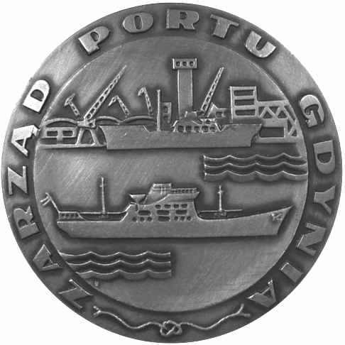 R/ Na gładkiej powierzchni u góry statek w porcie, poniżej statek na morzu. W otoku napis ZARZĄD PORTU GDYNIA.