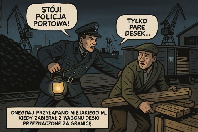 W związku z falą kradzieży w porcie policja zintensyfikowała nocny nadzór i ujęła robotnika M. na kradzieży desek z wagonu; po przyznaniu się do kilku podobnych czynów trafił do więzienia w Wejherowie.