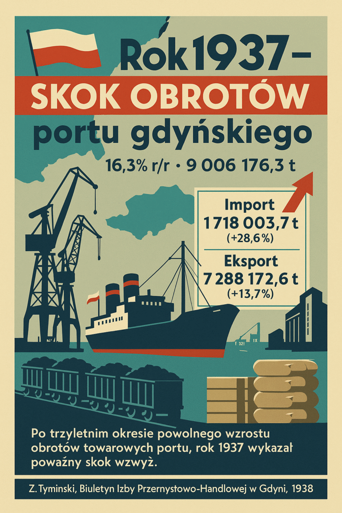 Zamorskie obroty towarowe portu gdyńskiego w 1937 roku (9.006.176,3 ton) wykazują poważny 16,3%-owy ,wzrost w porównaniu z obrotami w 1936 r. (7.742.945,9 ton).