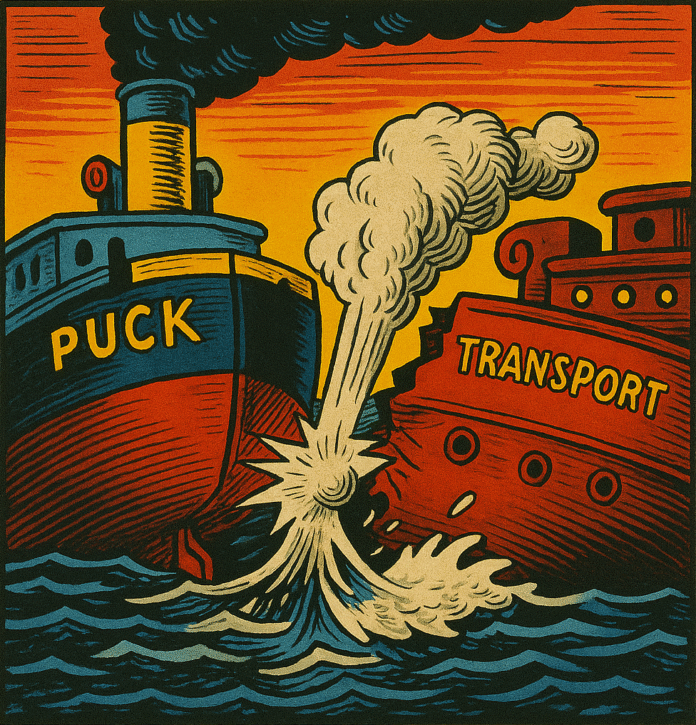 Wczoraj o godz. 17.30 wydarzył się w porcie gdyńskim niezwykły i bardzo poważny w skutkach wypadek żeglugowy. Przy Nabrzeżu Pilotowym stał przycumowany stary statek typu rzecznomorskiego, parowiec „Transport”, będący własnością prywatnego armatora p. Wilgórskiego. Jednostka ta, o pojemności 161 t rejestrowych brutto, została zbudowana w 1882 r., a więc 55 lat temu, mimo to jednak bez zarzutu pełniła służbę nawigacyjną, kursując z towarami w żegludze przybrzeżnej między Gdynią a Gdańskiem. O wspomnianej godzinie przybył do Gdyni z Rotterdamu statek „Puck”, który miał zatrzymać się przy Nabrzeżu Francuskim. Aby zająć przewidziane dlań miejsce, musiał w basenie portowym wykonać zwrot. W czasie tego manewru ciężko załadowany „Puck” najechał rufą na przycumowany przy nabrzeżu parowiec, miażdżąc mu burtę na szerokości blisko 2 metrów i zadając śmiertelną ranę. W ciągu ośmiu minut „Transport”, spowity w obłoki pary z rozdartych rur, poszedł na dno. O ratowaniu statku w tych warunkach mowy być nie mogło. Szczęściem było jeszcze to, że załoga — składająca się z właściciela i jednocześnie kapitana statku, jego żony oraz trzech marynarzy — zdołała wydostać się na brzeg bez szwanku. „Puck” wyszedł z wypadku z jedynie lekko powgniatanymi płytami poszycia. Niezwłocznie po awarii Wydział Ratowniczy „Żeglugi Polskiej” wszczął akcję w celu zabezpieczenia wraka przed wywróceniem się. Przytroczono go mocno do nabrzeża, przy którym obecnie posępnie sterczy z wody jedynie maszt. Nad wrakiem czuwają holowniki „Tytan” i „Bizon”. Waga zatopionego parowca wynosi około 100 ton bez ładunku. Sam ładunek był niewielki: zaledwie 5 ton mąki i 7 ton węgla. Dziś rozpoczęte będą prace nad wydobyciem statku z dna basenu na powierzchnię. Czynność tę prawdopodobnie uskuteczni dźwig pływający, sprowadzony z Gdańska; dźwig stoczni gdyńskiej ma bowiem maksymalną nośność tylko 75 ton. Dramatem właściciela „Transportu” jest to, iż statek nie był ubezpieczony.