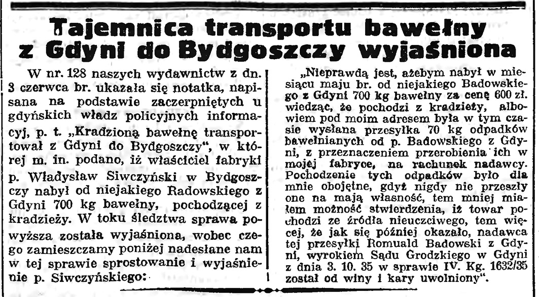 Tajemnica transportu bawełny z Gdyni do Bydgoszczy wyjaśniona
