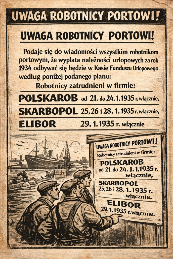 Uwaga robotnicy portowi! Podaje się do wiadomości wszystkim robotnikom portowym, że wypłata należytości urlopowych za rok 1934 odbywać się będzie w Kasie Fun duszu Urlopowego według poniżej podanego planu: Robotnicy zatrudnieni w firmie: Polskarob od 21. do 24, 1. 1935 r. włącznie. Skarbopol 25, 26 i 28. 2. 1935 r, włącznie. Elibor 29. 1. 1935 r. włącznie // Gazeta Kaszubska 1935, nr 17, s. 3